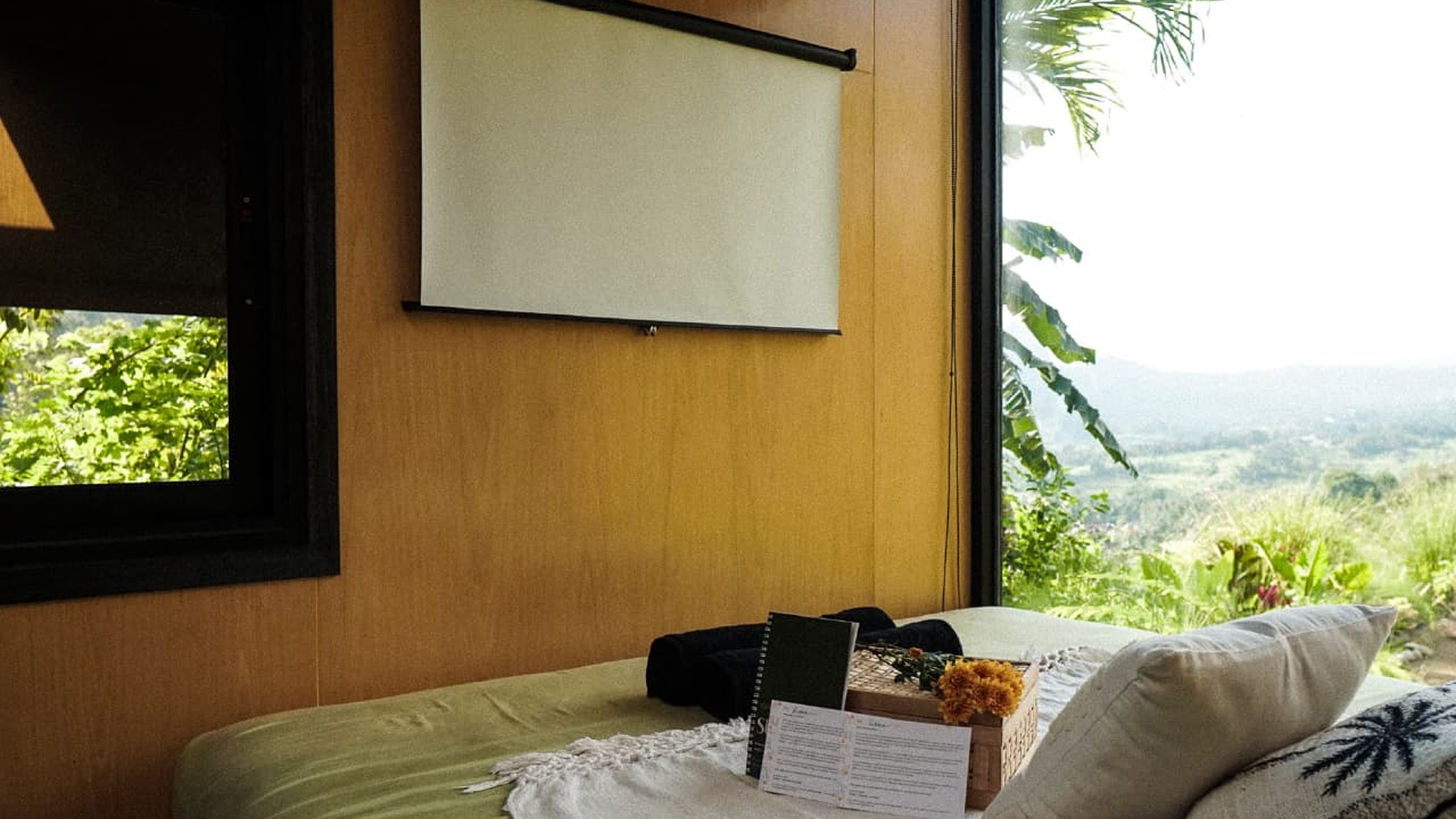 Positioned in front of the bed, the projector turns the cabin into a cozy personal theater. Paired with the king-size bed and the calm of nature, it invites slow evenings, shared moments, and effortless relaxation.